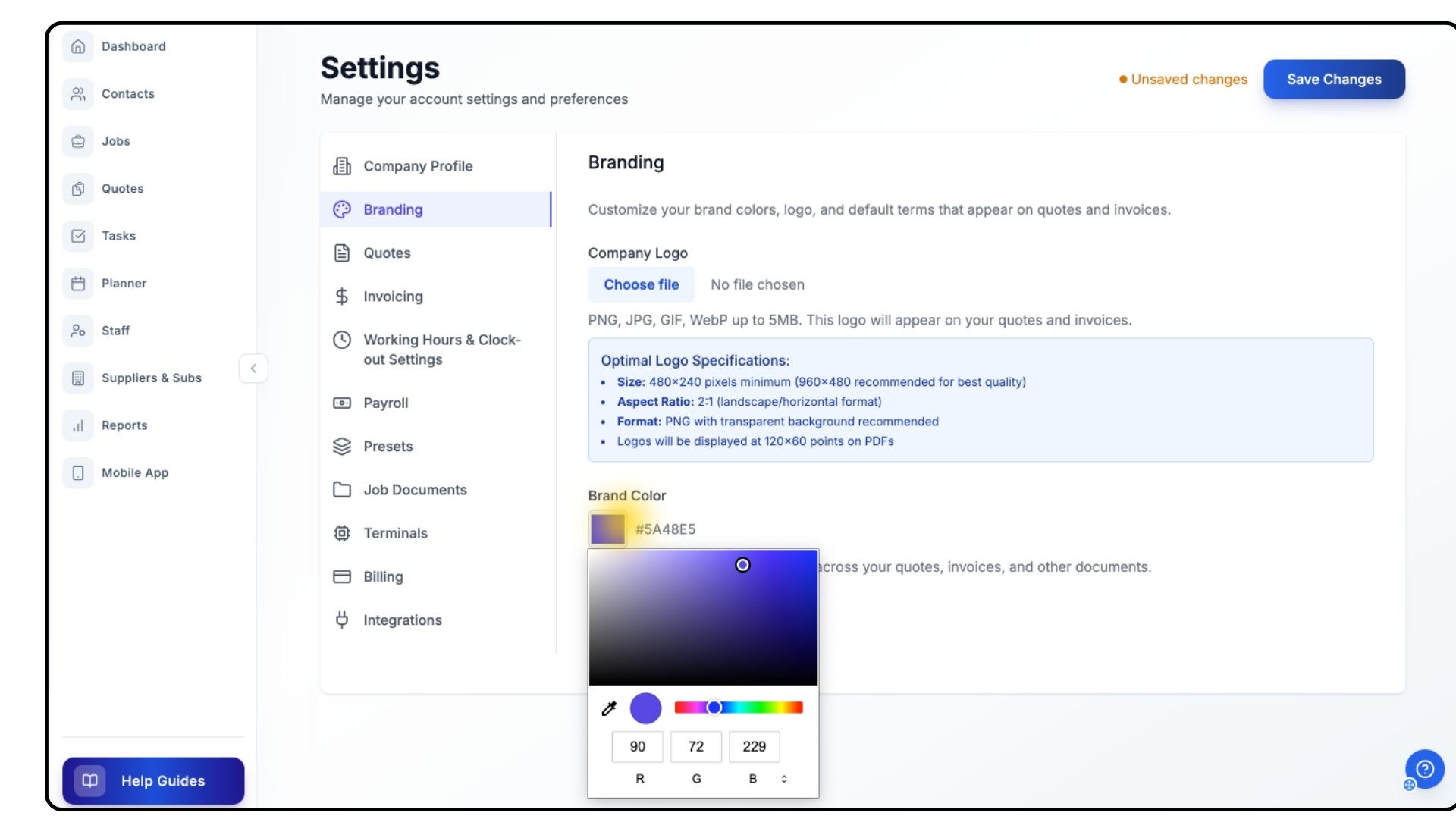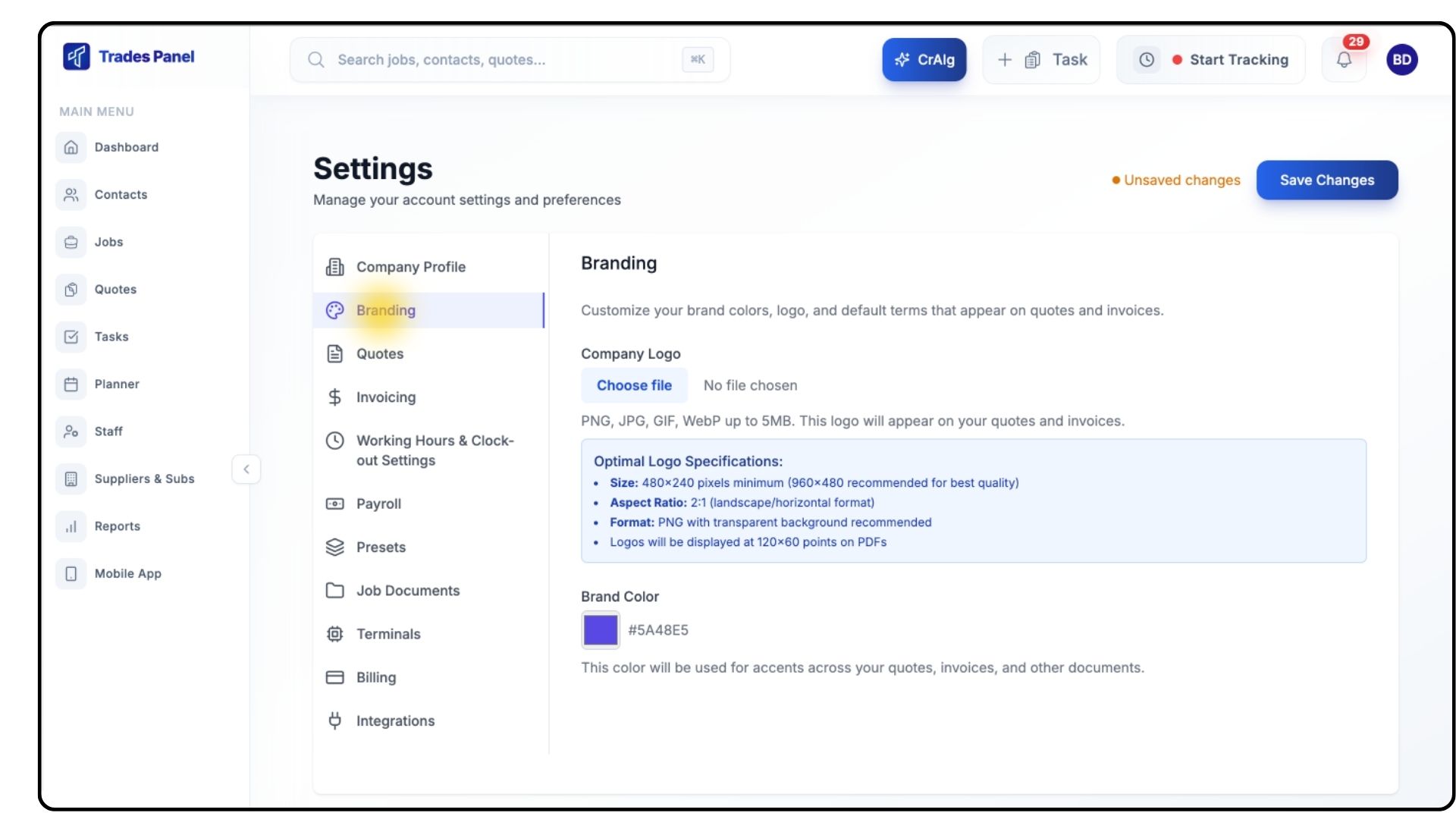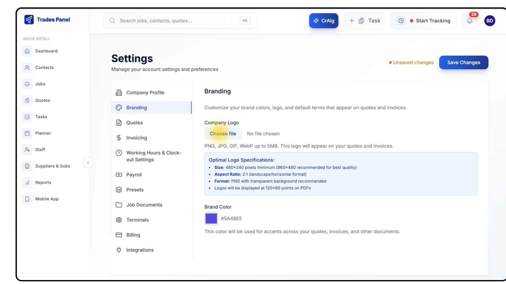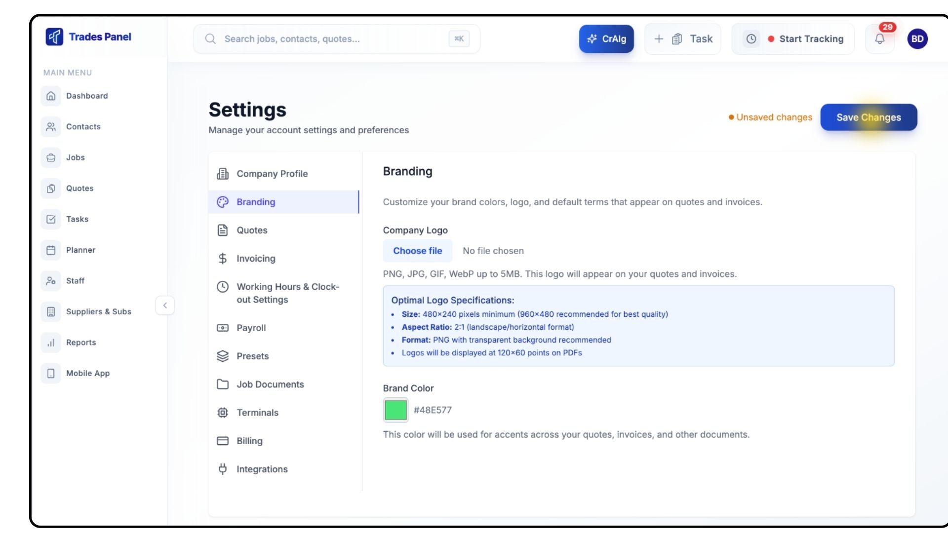 The Branding settings allow you to customise all your Trades Panel documents — including quotes, invoices, and change orders — with your company logo and brand colour. This ensures consistent, professional branding across every exported document.