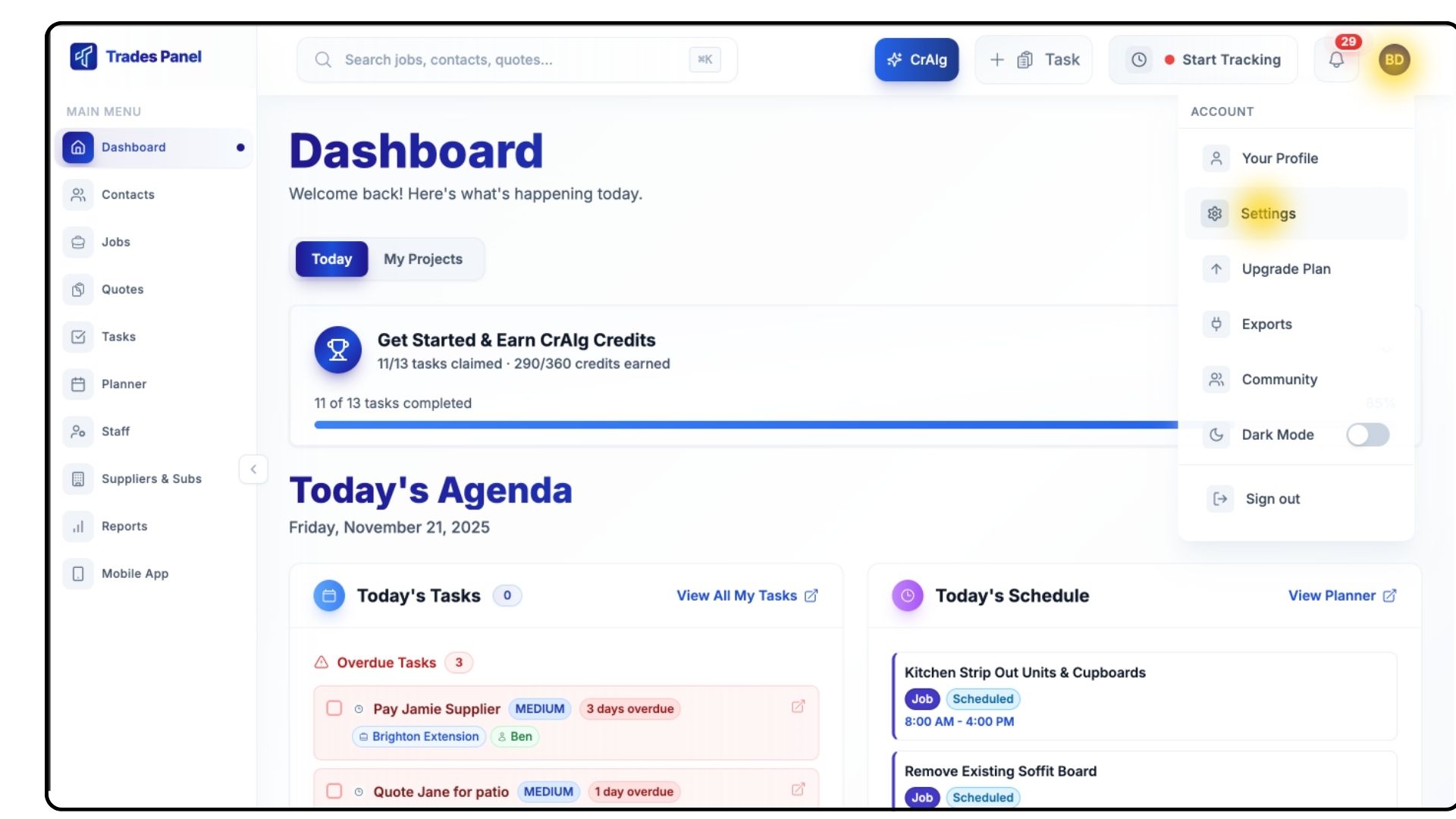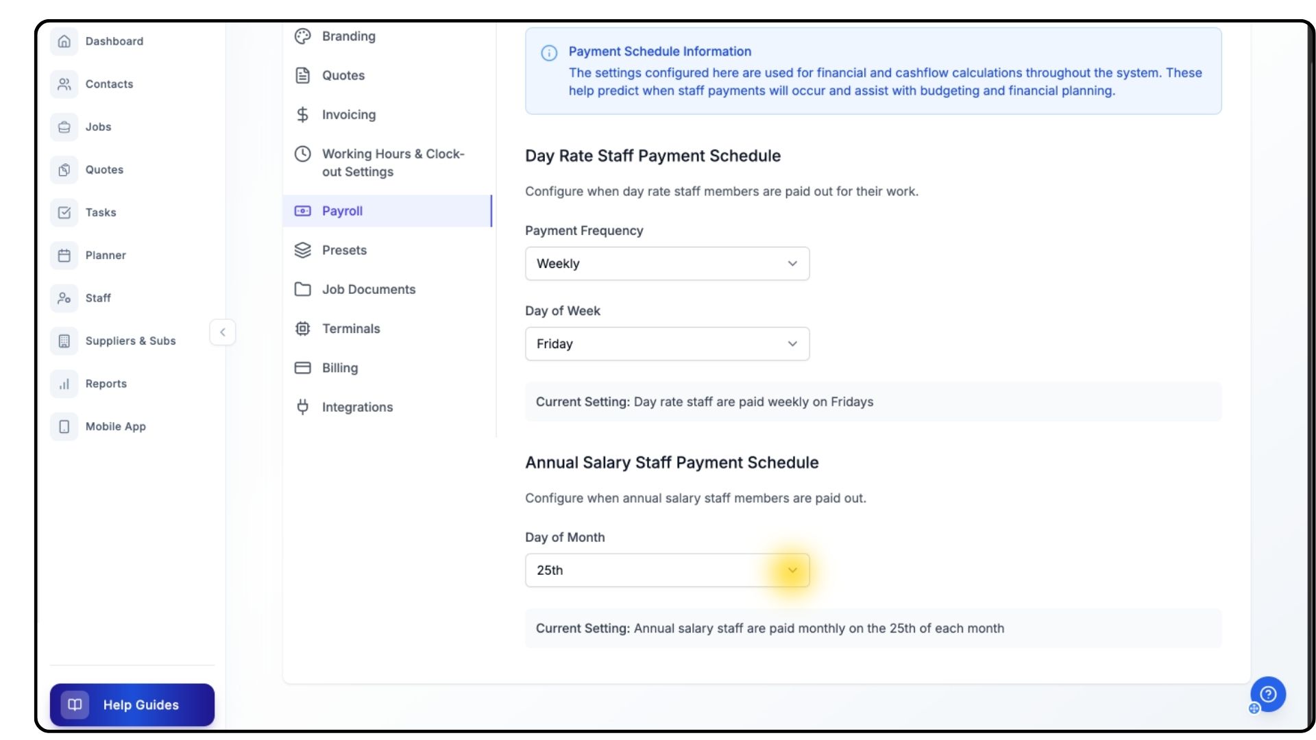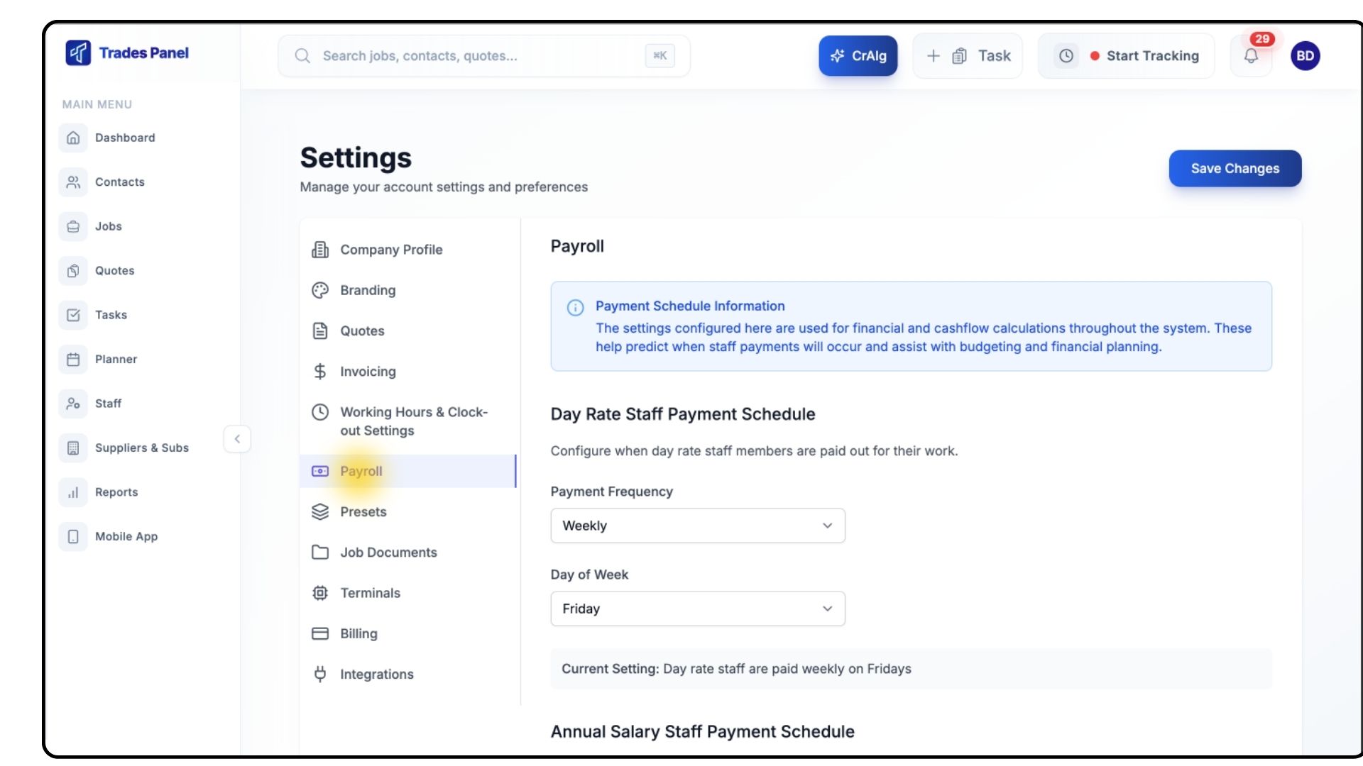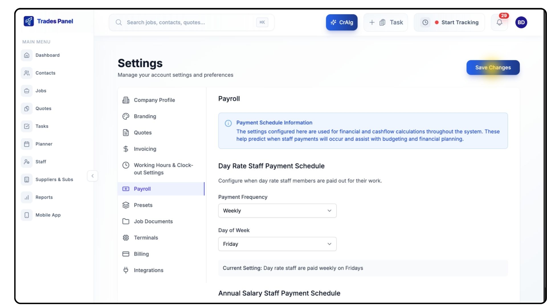The Payroll settings in Trades Panel allow you to configure how and when your staff are paid — whether they’re on day rates or annual salaries. Setting this up ensures your team is paid accurately and consistently.