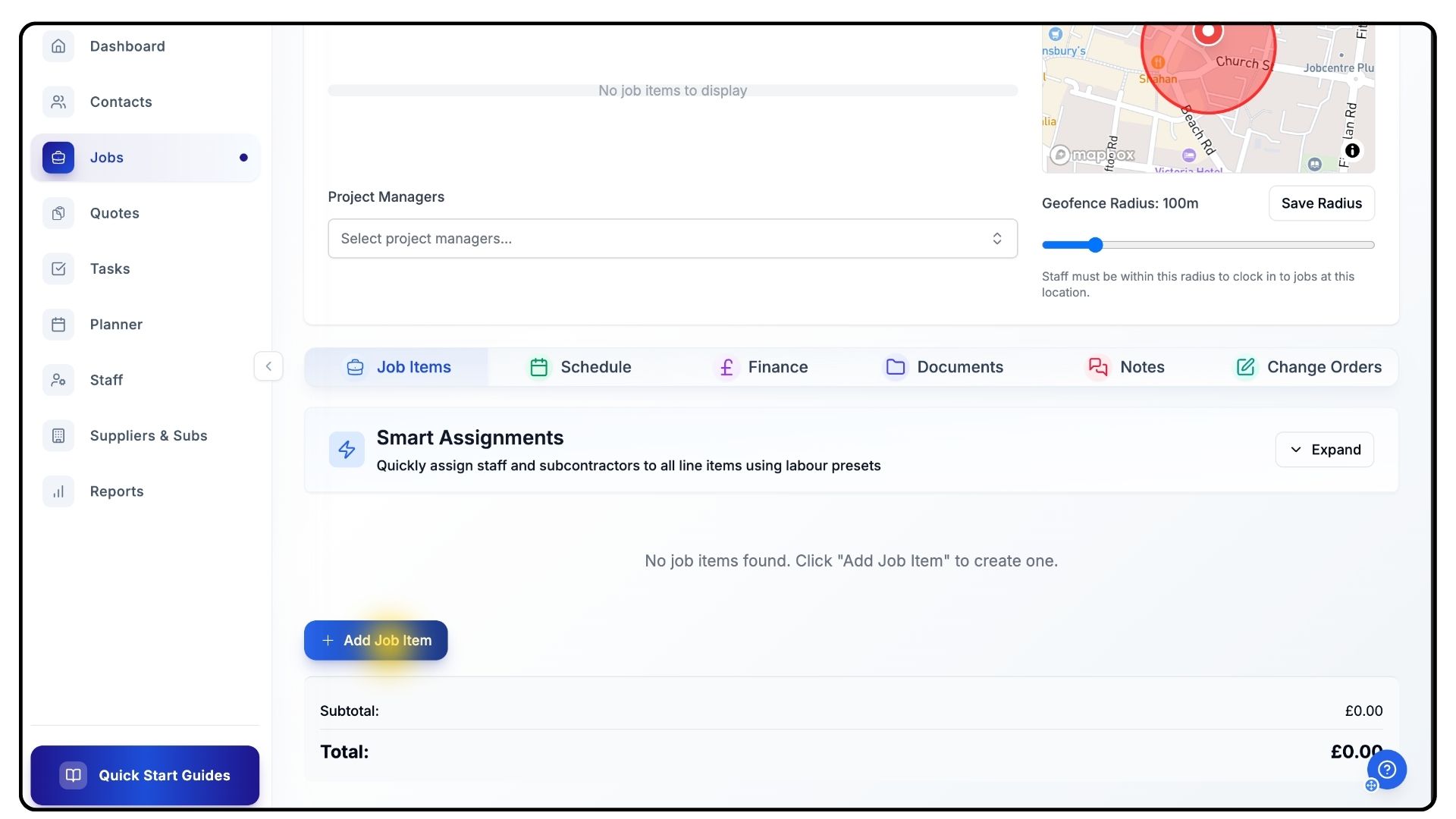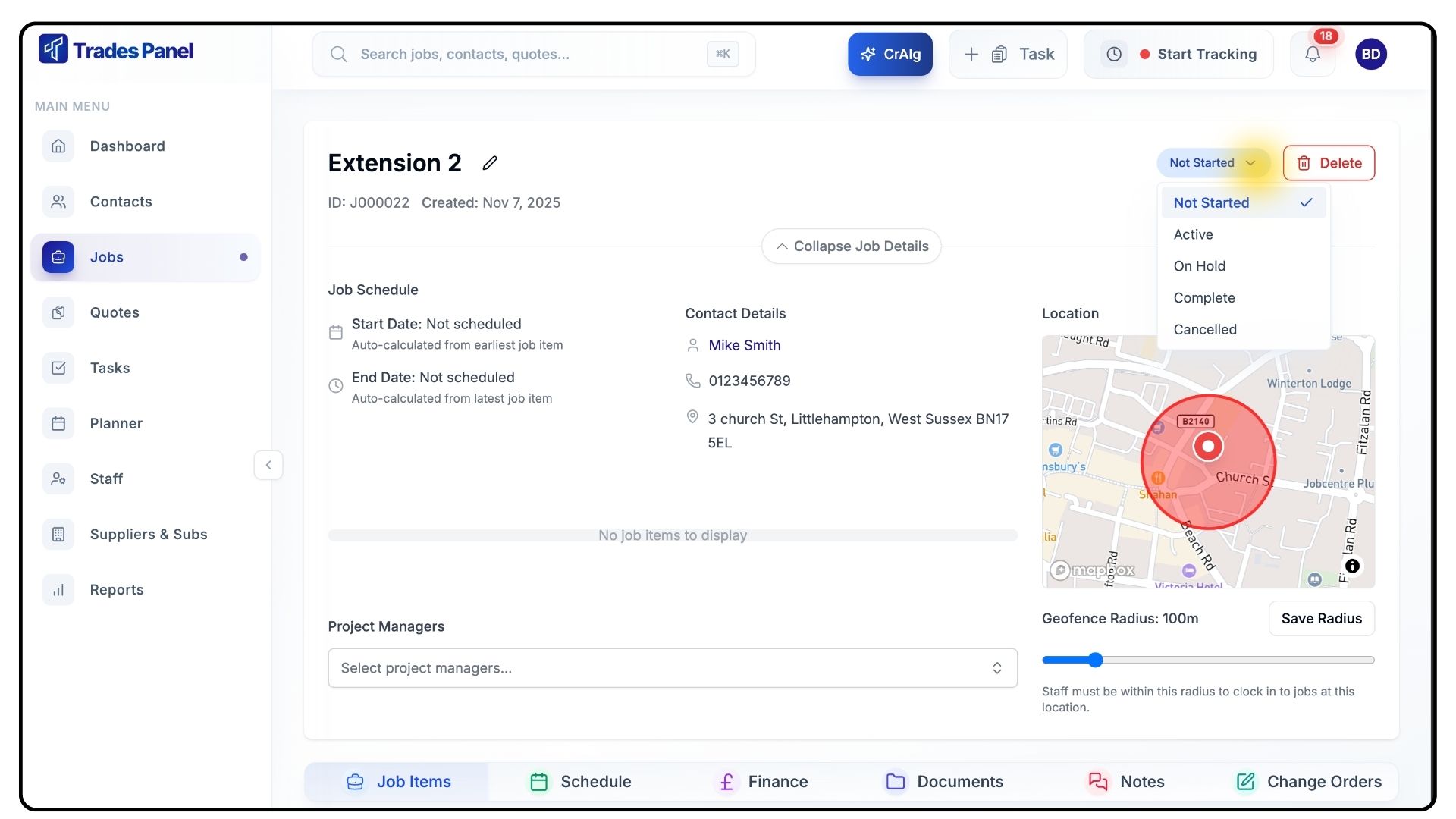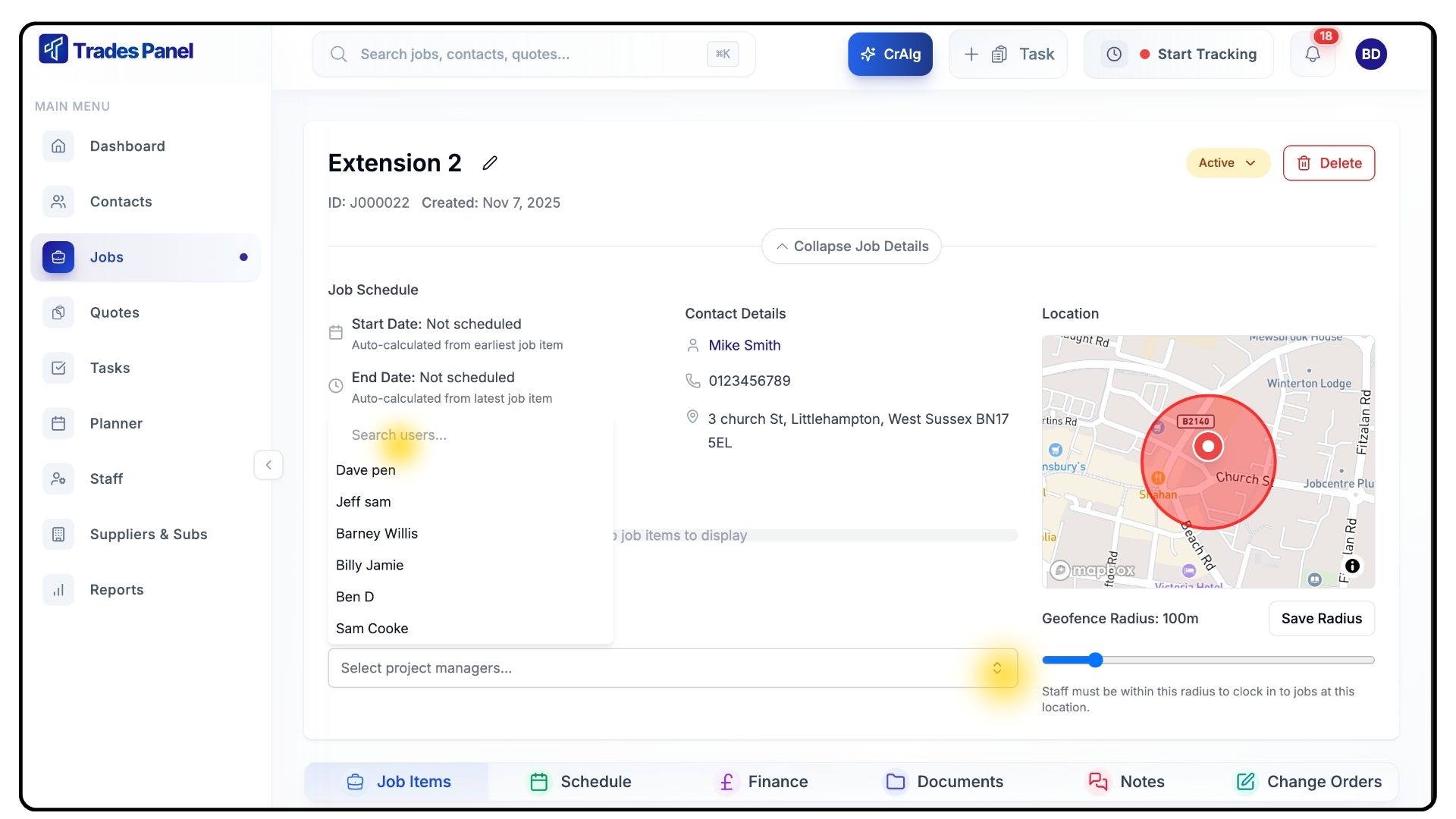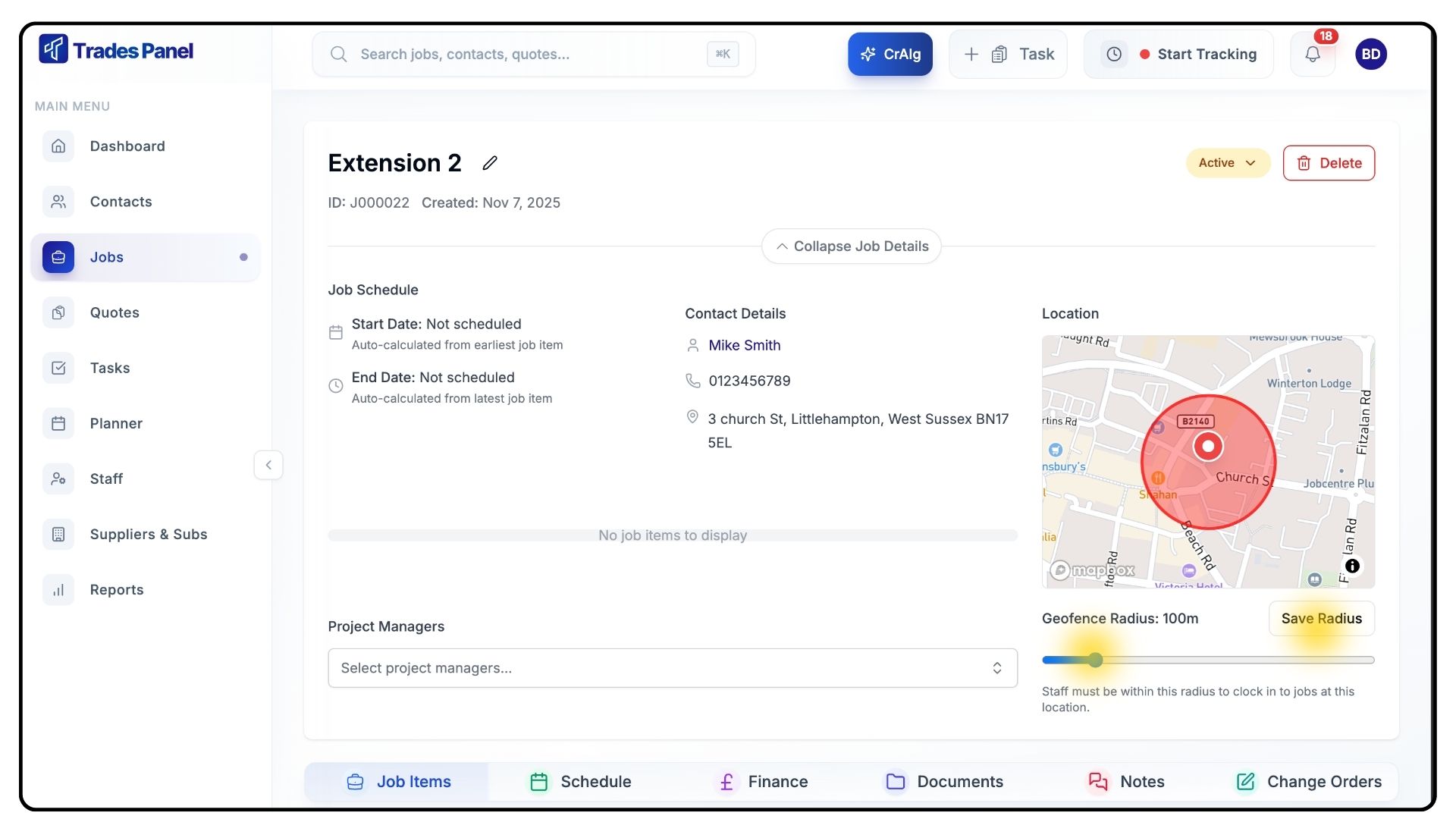Job Management in Trades Panel helps you create, view, and manage every project in one place. From assigning managers and defining site boundaries to adding detailed job items and line items, this feature ensures your team stays organised and every phase of your project is tracked clearly.