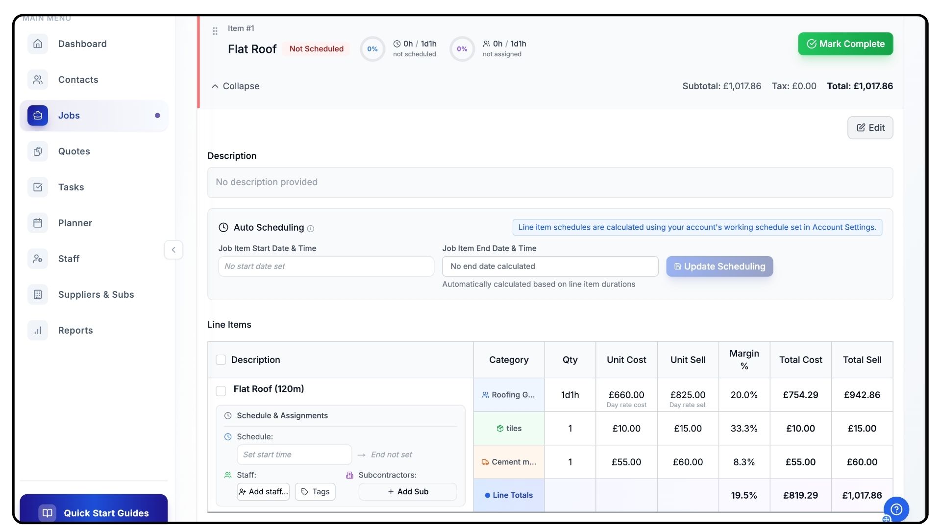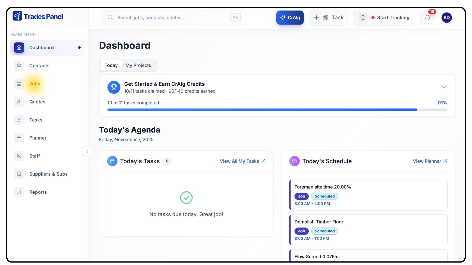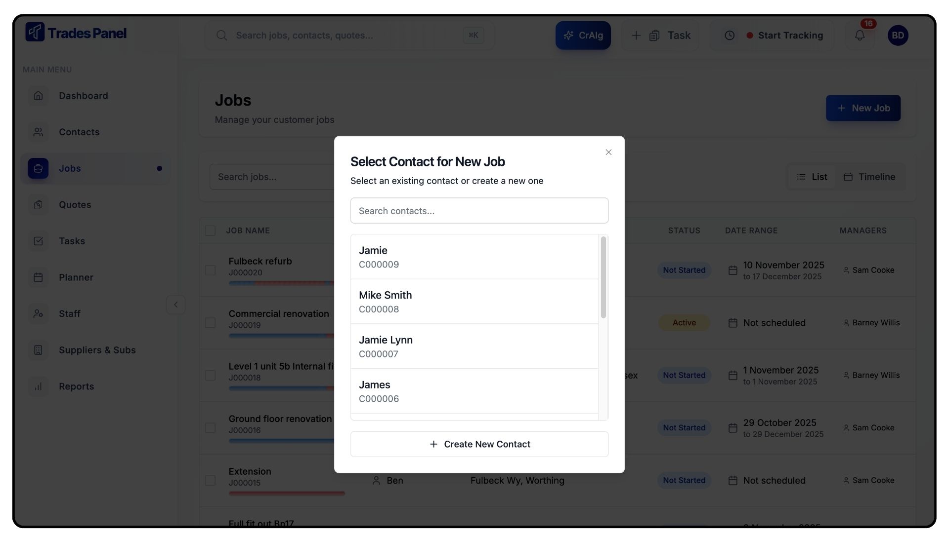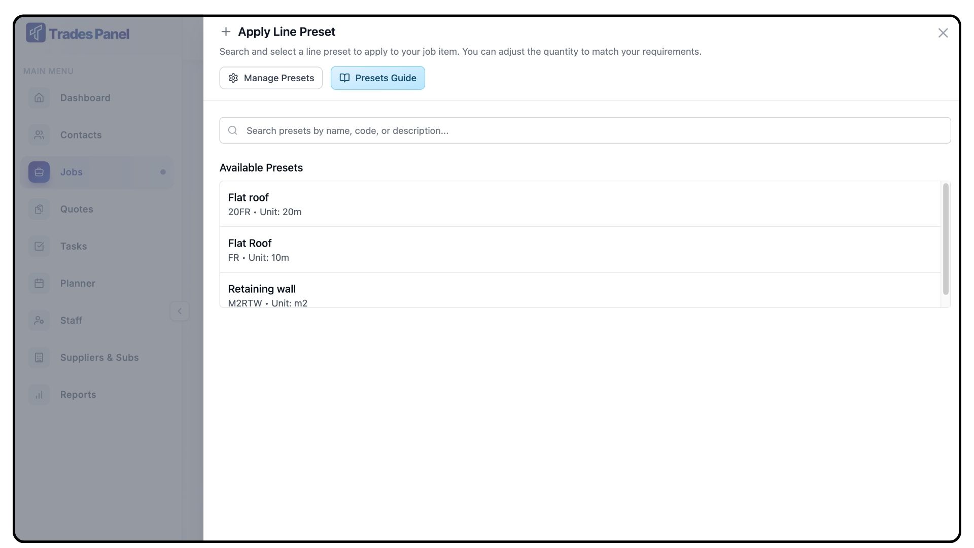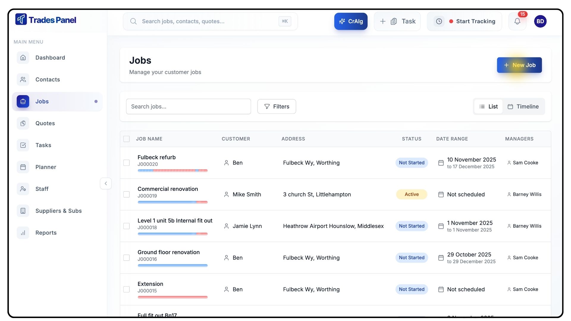 Job Management in Trades Panel helps you create, view, and manage every project in one place. From assigning managers and defining site boundaries to adding detailed job items and line items, this feature ensures your team stays organised and every phase of your project is tracked clearly.