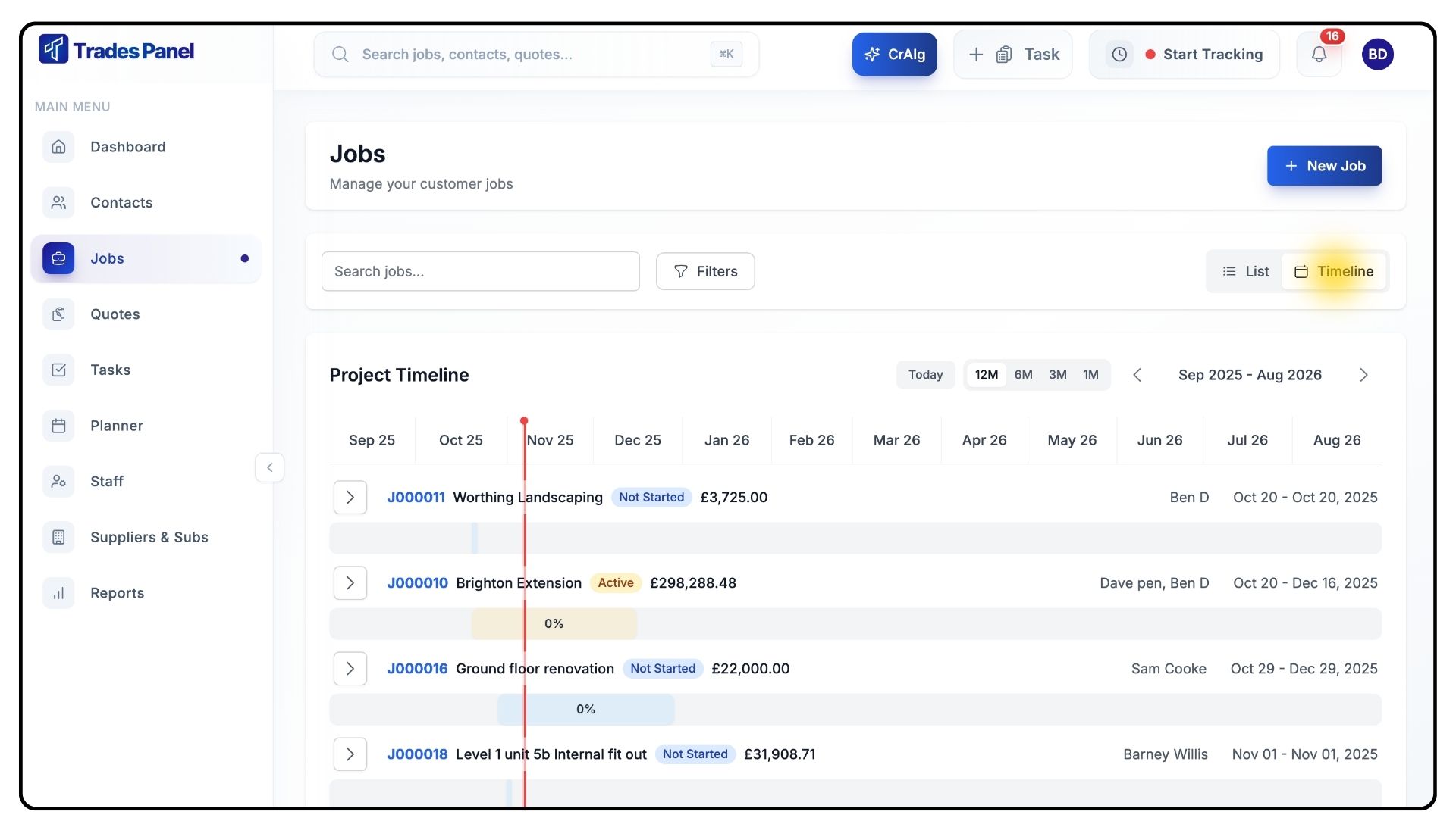 The Jobs section gives you an overview of all active projects, with filters and timeline views for easier management and scheduling.