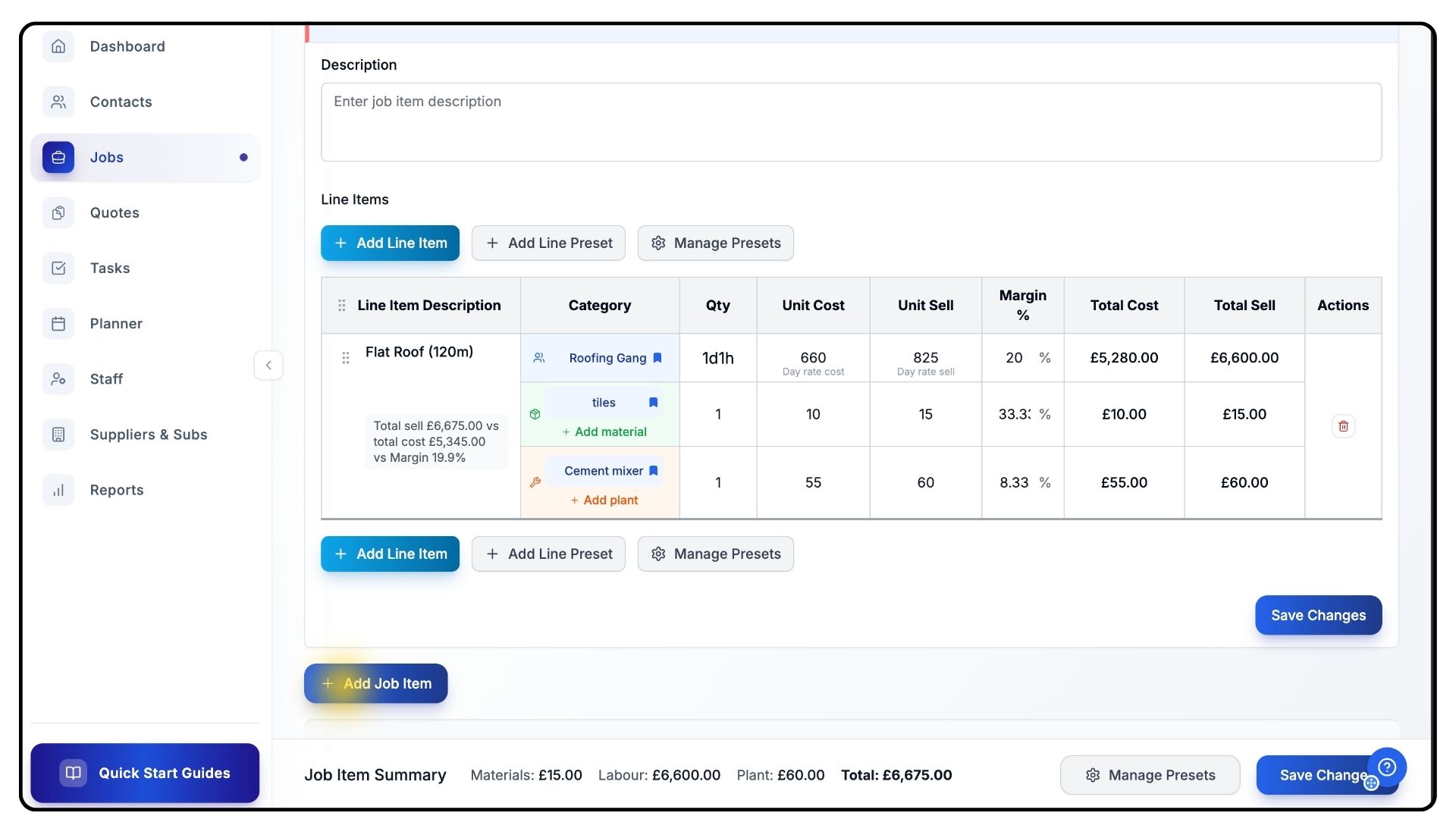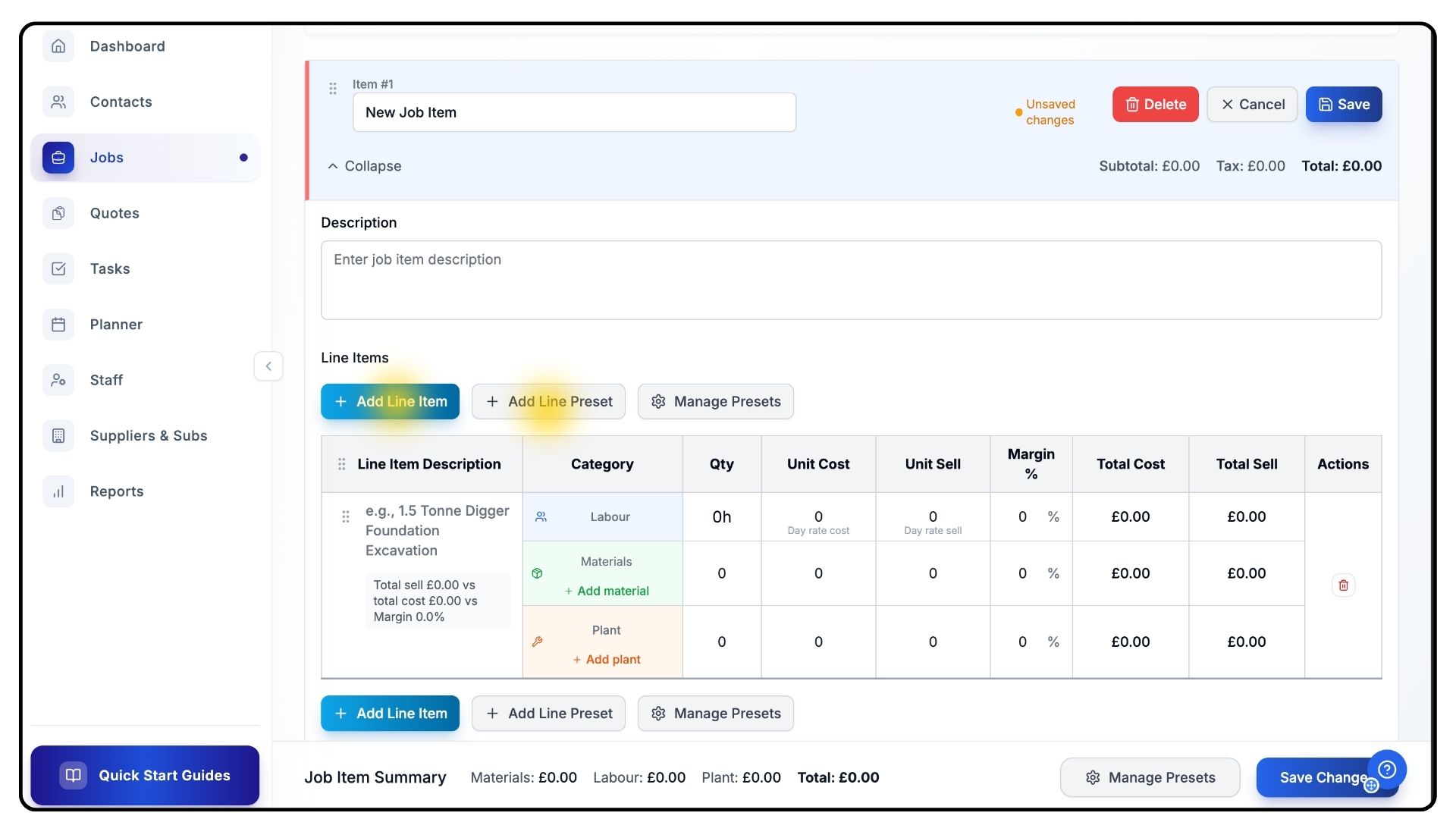 Line Items represent individual tasks under each Job Item. They can include labour, materials, and plant — the core components of your project’s work.