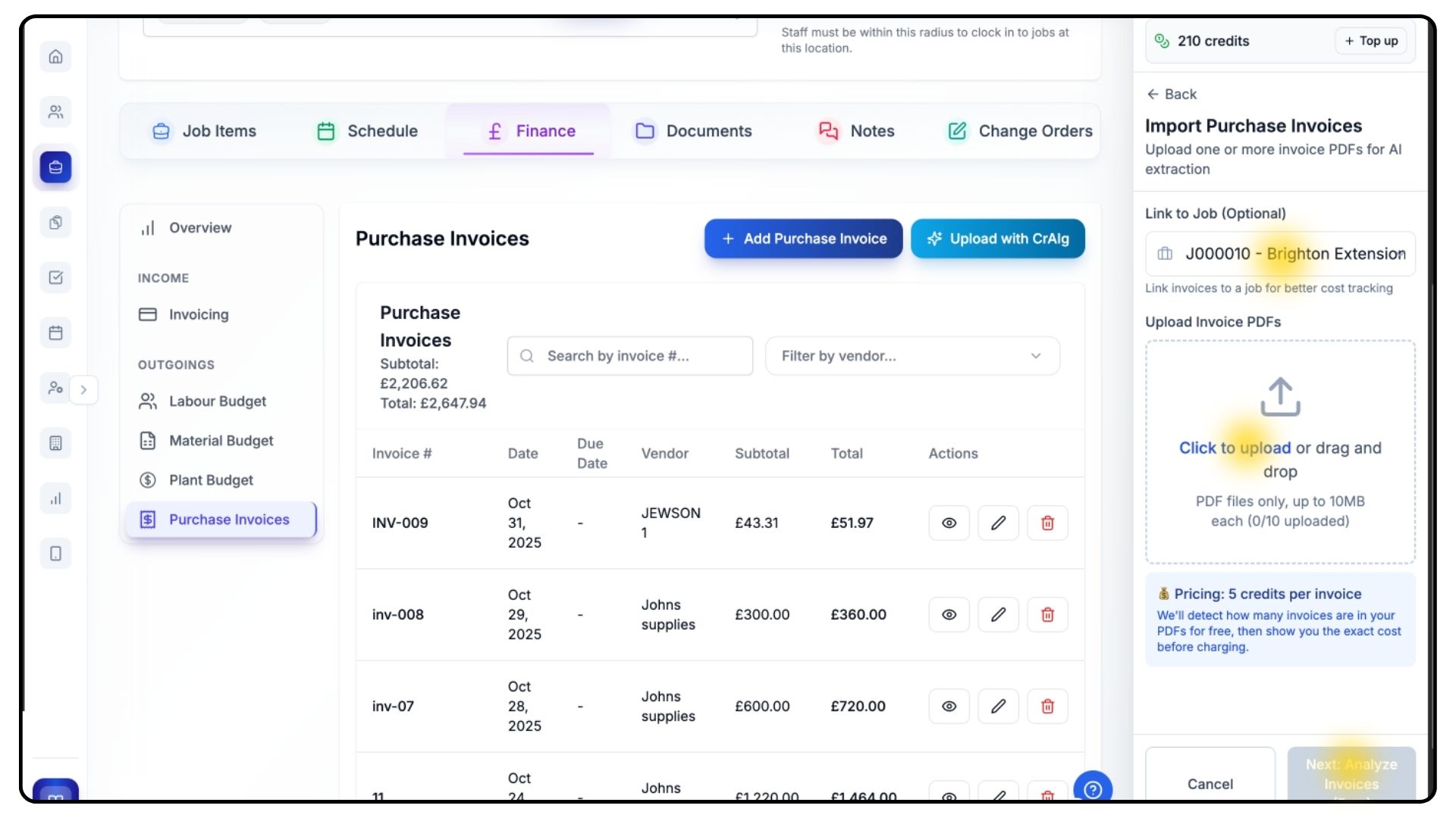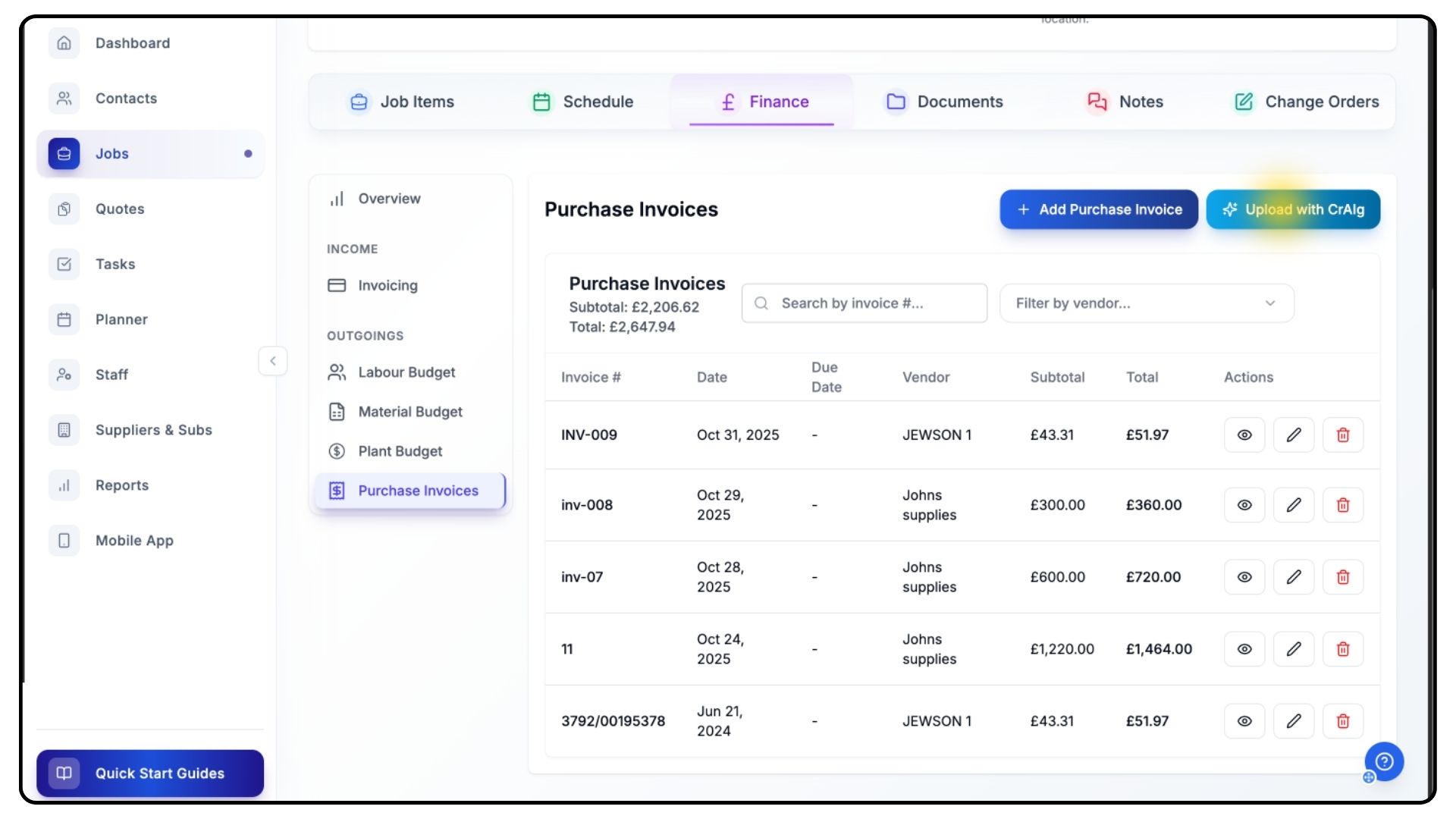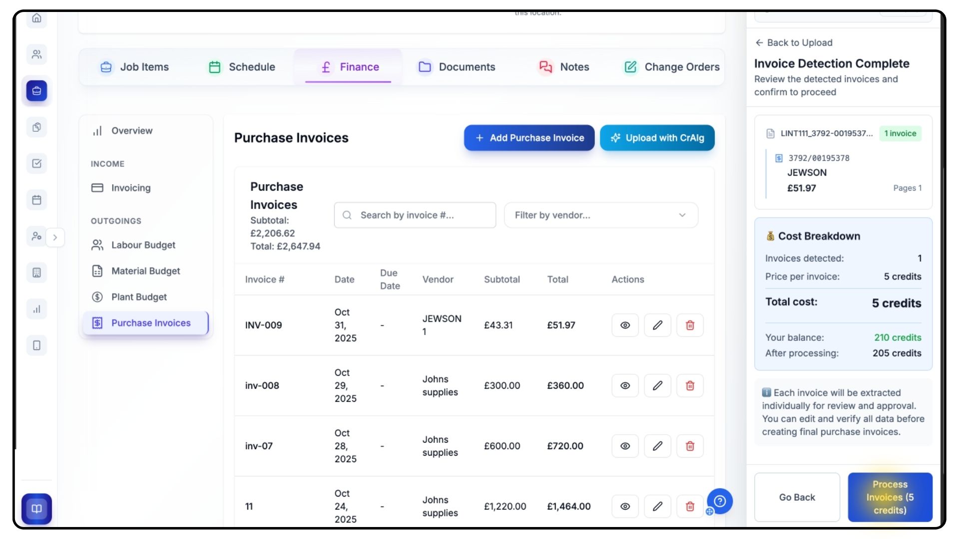 CrAIg is Trades Panel’s built-in AI tool that automatically extracts data from invoice PDFs, saving time and reducing manual entry.