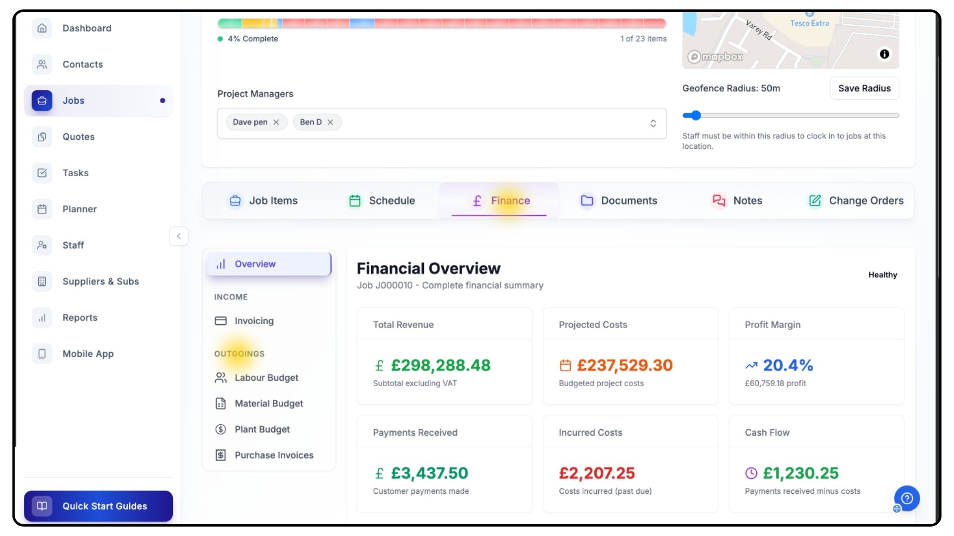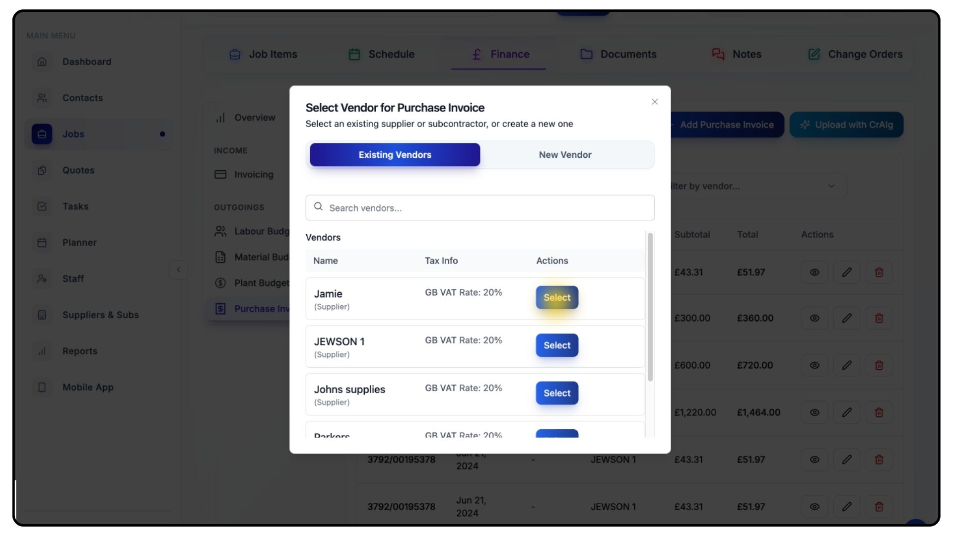 All outgoing costs for a project can be viewed and managed within the Finance section of the job.