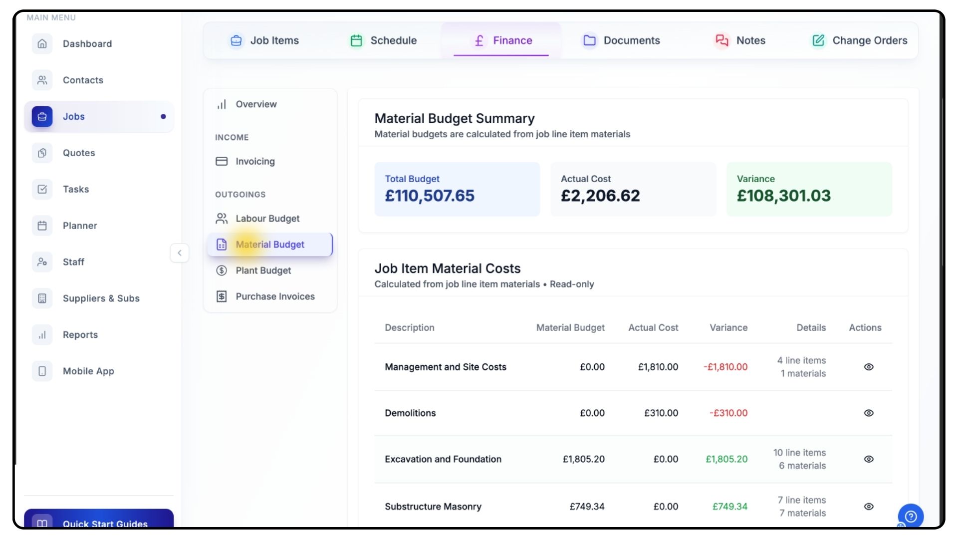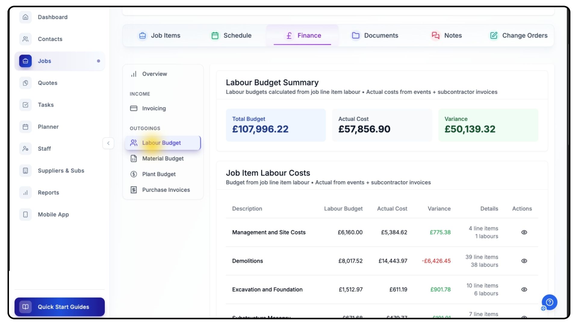 The Outgoings tab acts as your live cost-tracking dashboard, keeping your budgets and expenditure aligned with project progress.