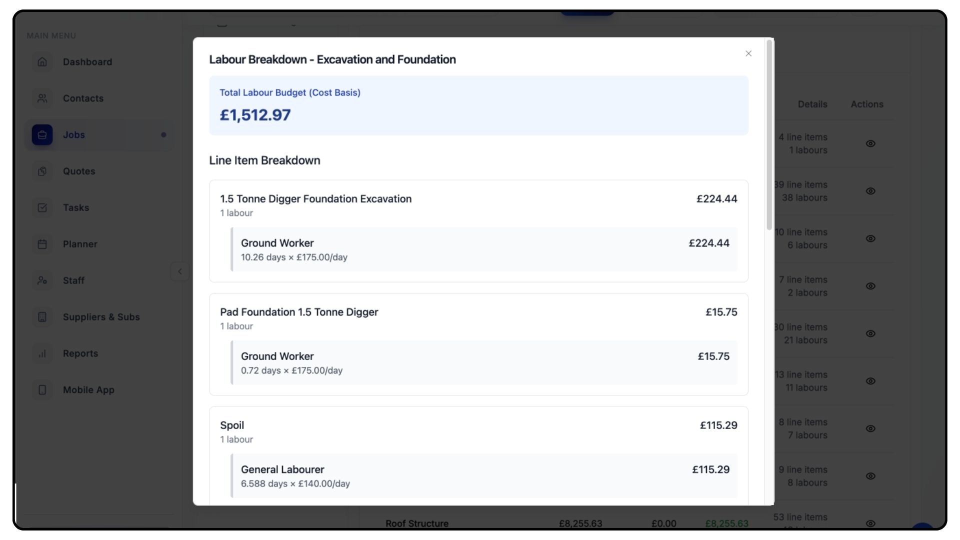 This opens a full breakdown showing every line item within that job item, along with the specific labour costs attached.