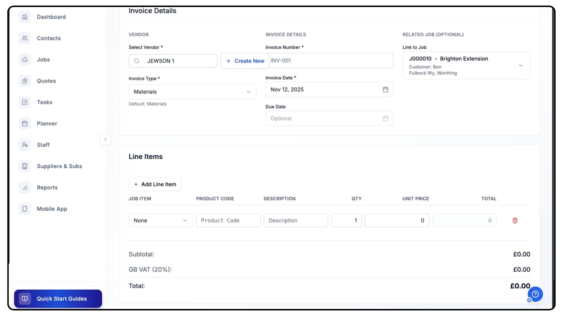 You’ll then need to assign the items from your purchase invoice to the relevant Job Items within your project.