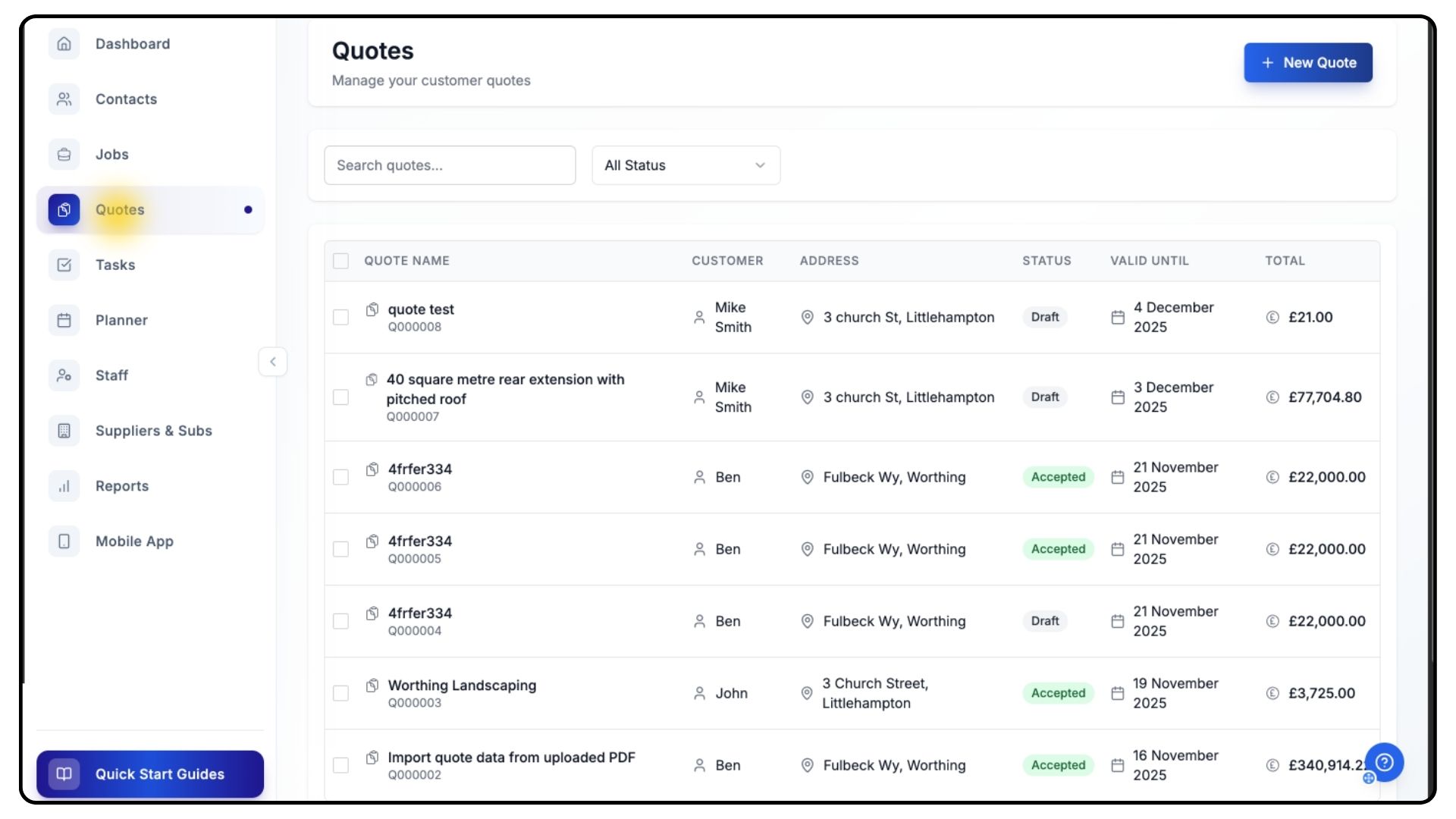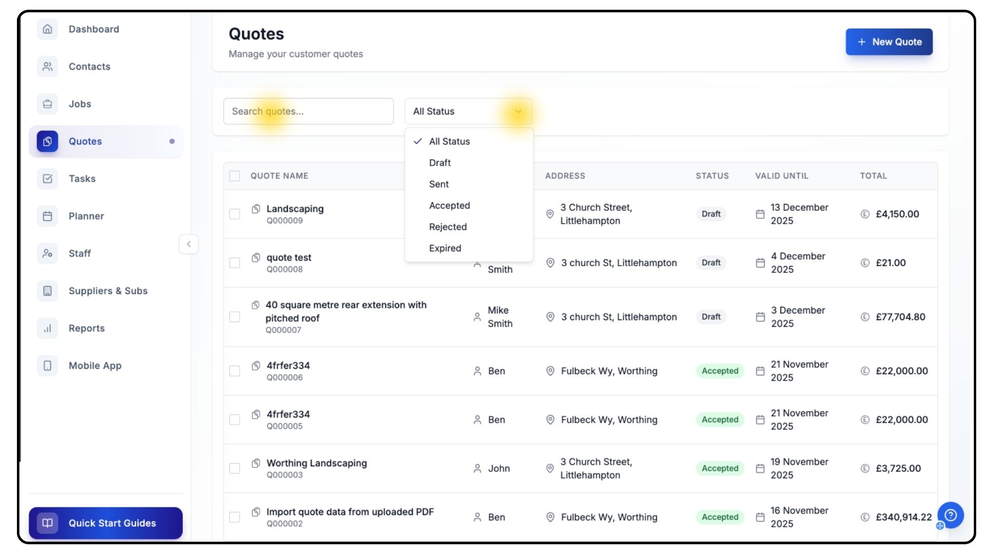 All your project quotes are stored within the Quotes area, which also allows you to search, filter, and manage their status.