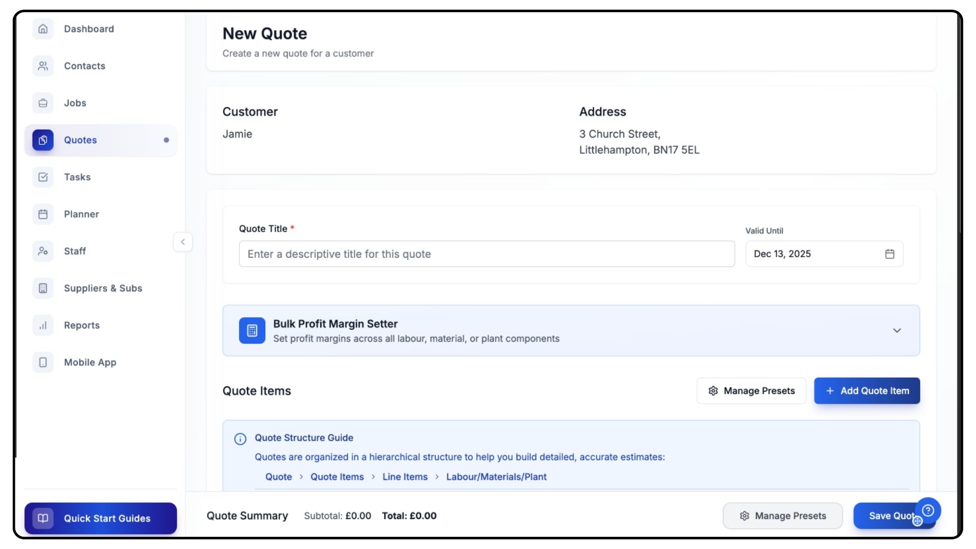 Manual quotes give you full control over your pricing and structure, allowing you to build detailed, stage-by-stage estimates.