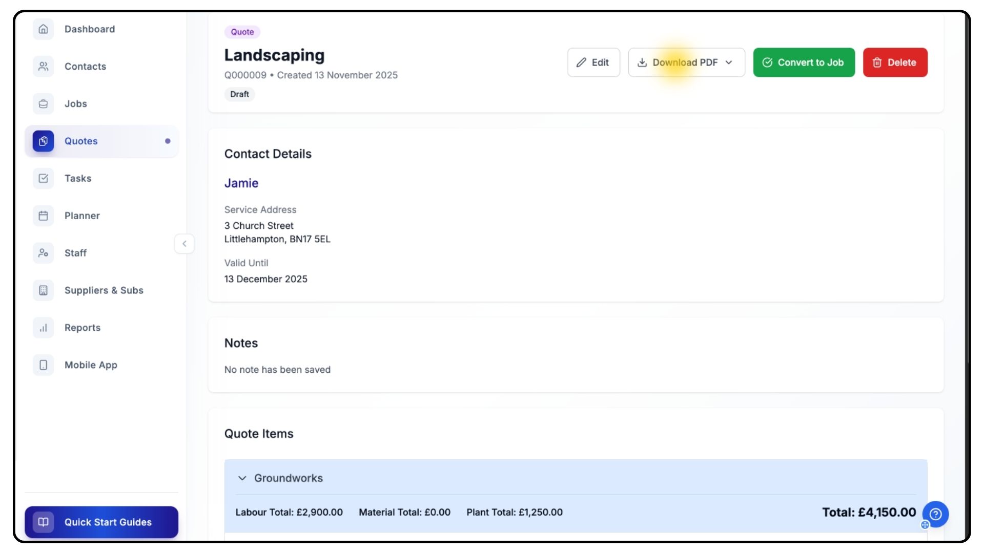 Once approved, quotes can be instantly converted into active jobs — keeping your workflow fast and consistent.