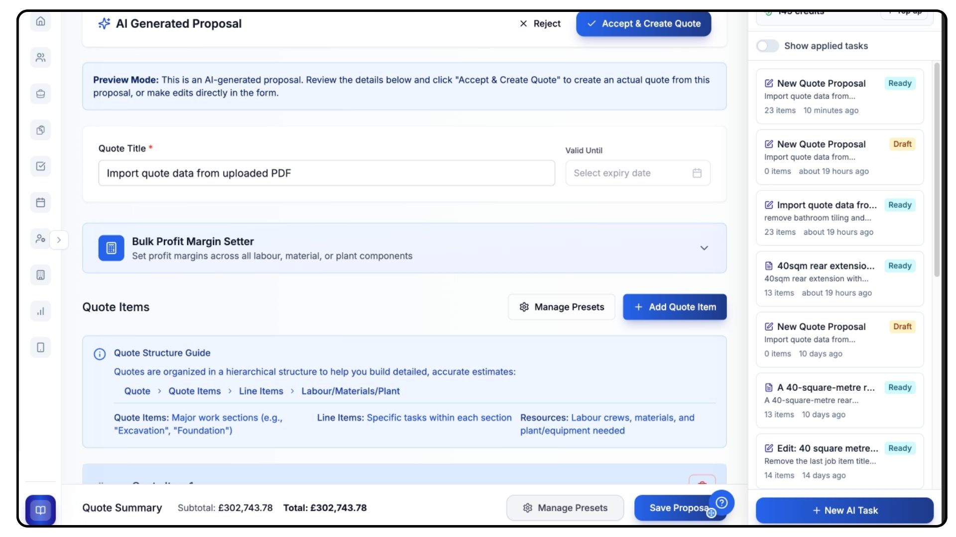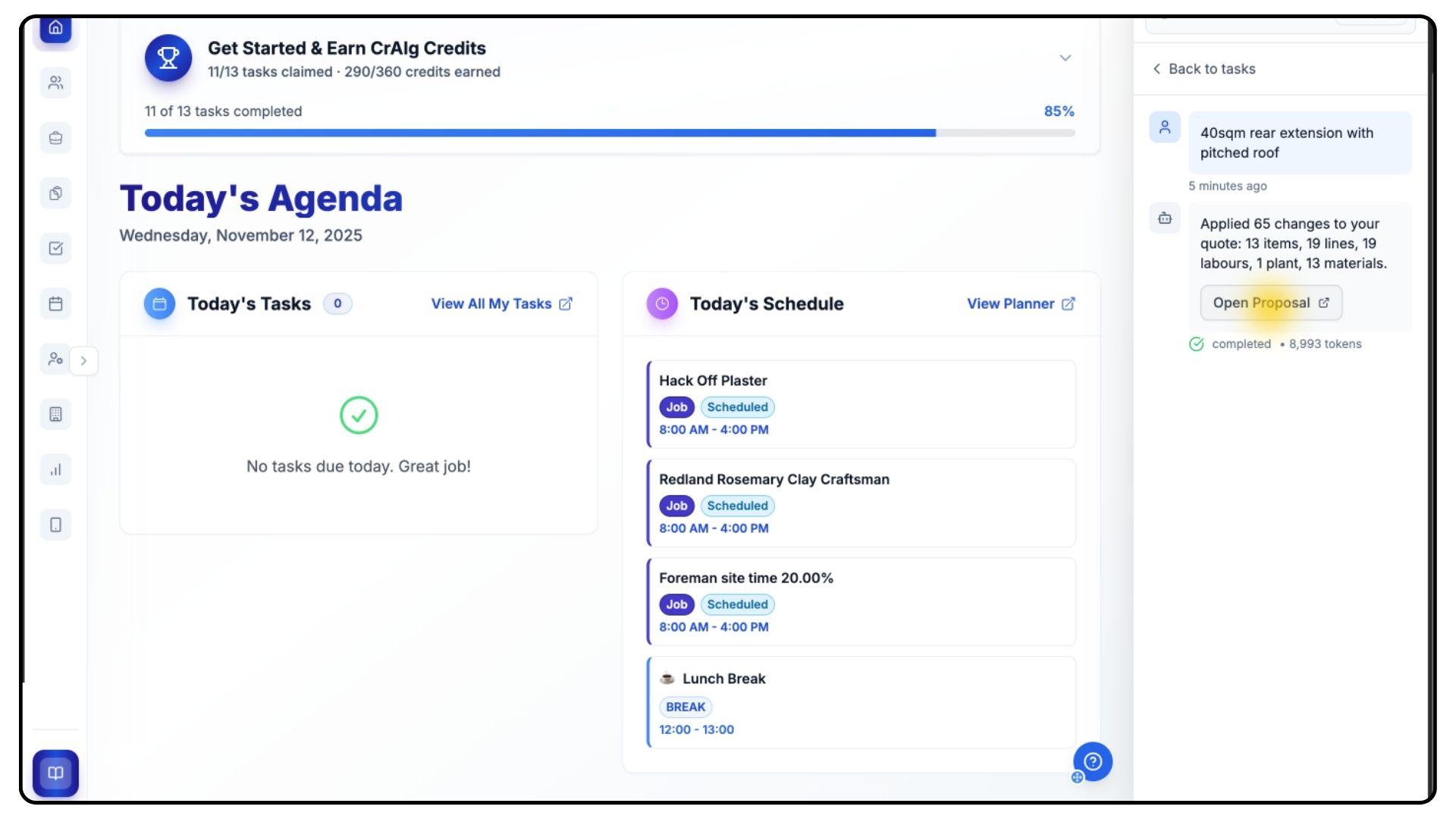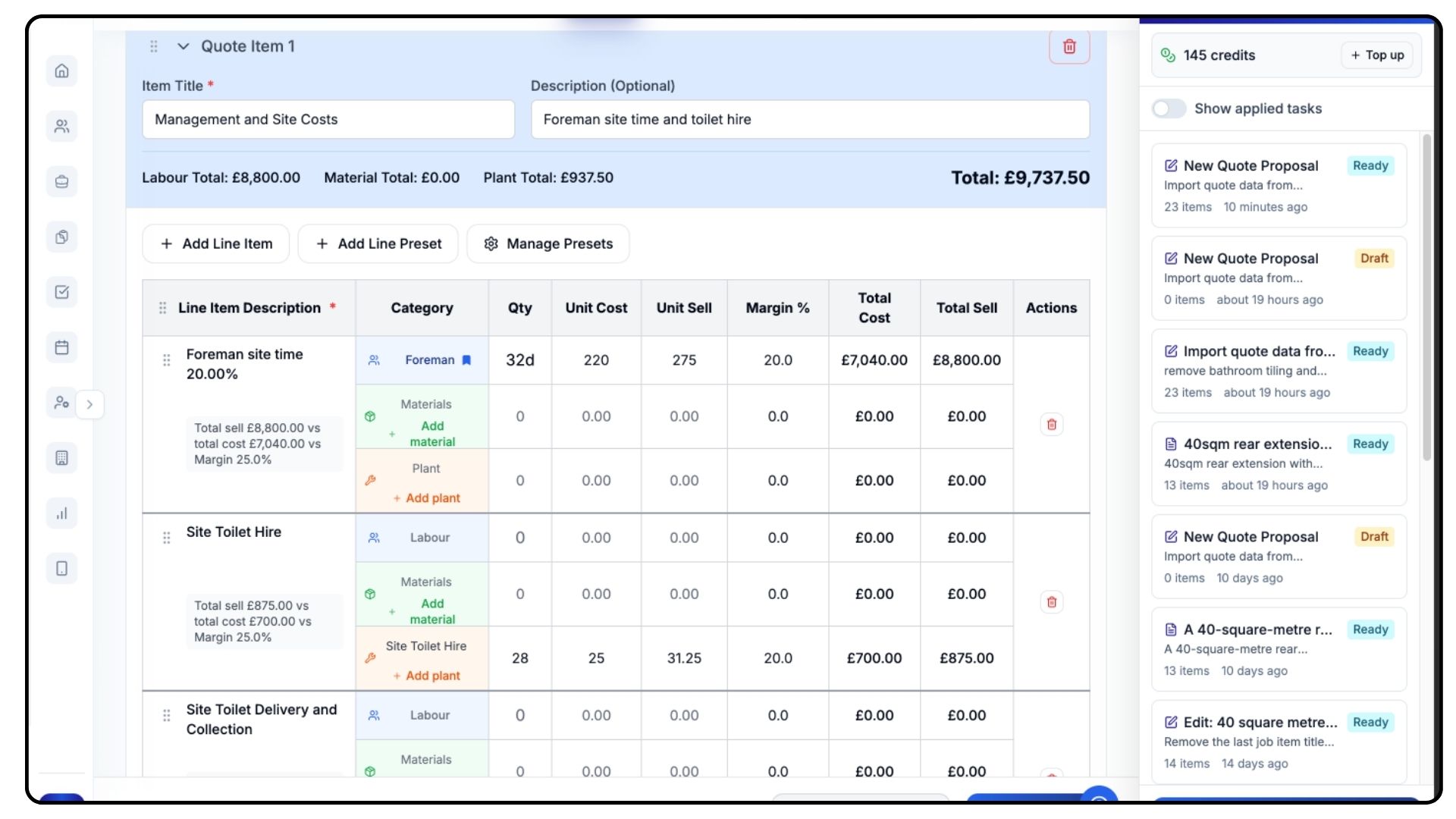 CrAIg’s output is a starting point — it uses your saved day rates and presets to estimate costs for labour, materials, and plant.