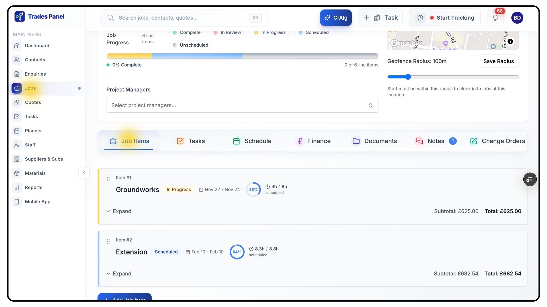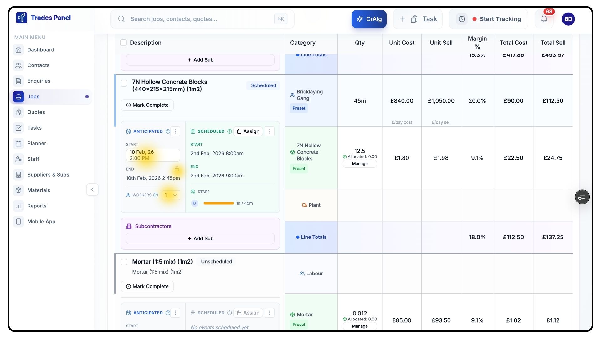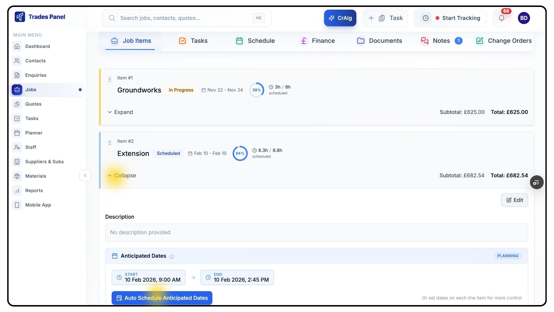 Once entered, TradesPanel will automatically populate anticipated dates for all line items within that job item.