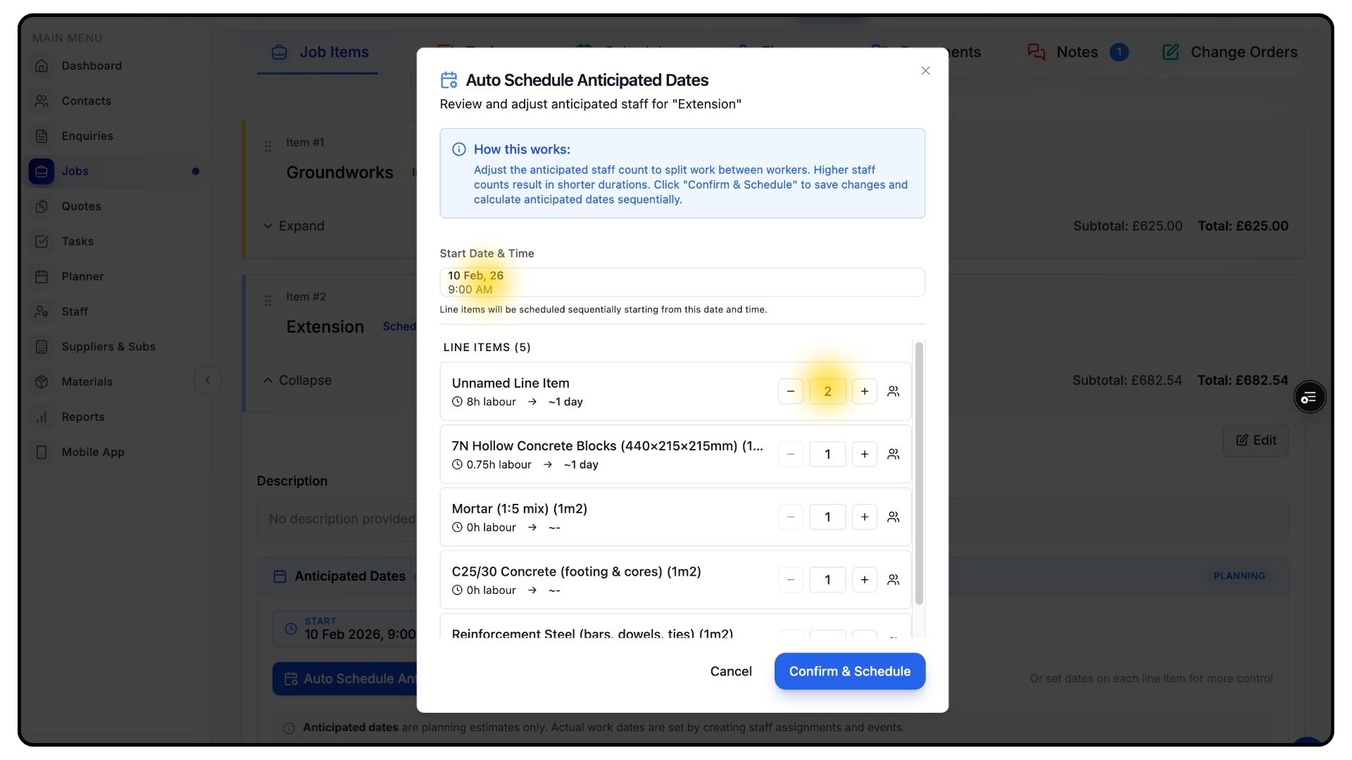 This allows you to schedule work by stages — for example, groundworks first, followed by brickwork.
