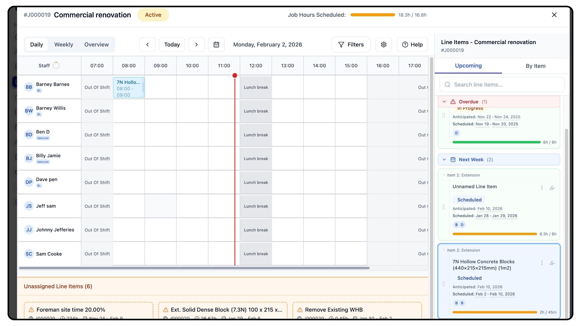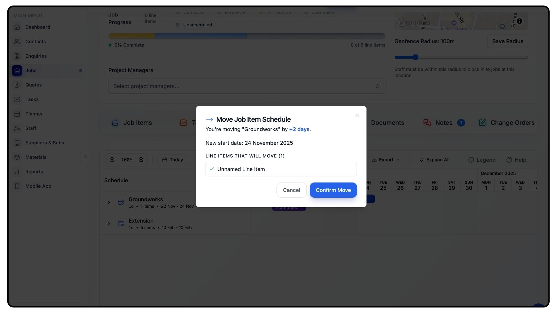 This opens the job’s schedule view, showing all job items and their associated line items.